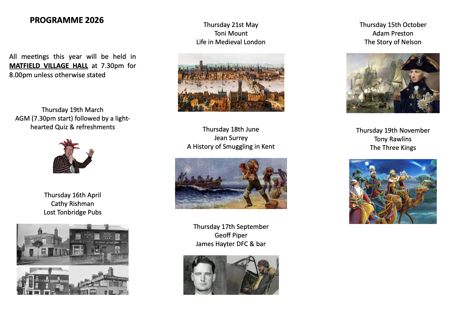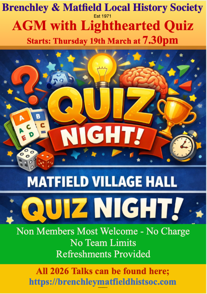 The next Society event will Our AGM and Quiz Night. Thursday 19th March 2026 at Matfield Village Hall 7pm for 7.30pm start.