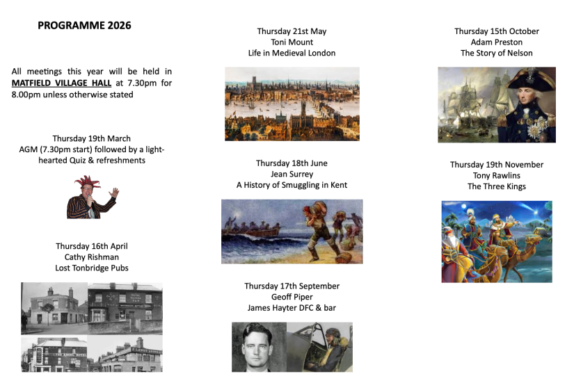 Our Meetings are on the third Thursday of the month. You are welcome to arrive from 7.30pm for an 8pm start unless otherwise stated. Tea and coffee wth biscuits offered (Small donation appreciated). Held at the Matfield Village Hall, Maidstone Road, Matfield, TN12 7LW or What 3 Words: bedding.taller.diverts